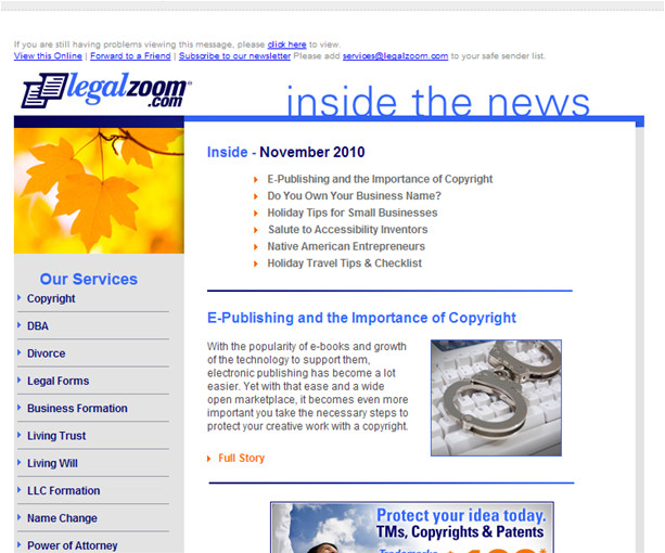 Example of LegalZoom Newsletter with table of contents and list of services they offer