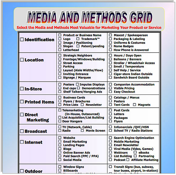 After you see their list, you may want to go over our MEDIA AND METHODS GRID, and identify the media and methods you want to use for your own business.